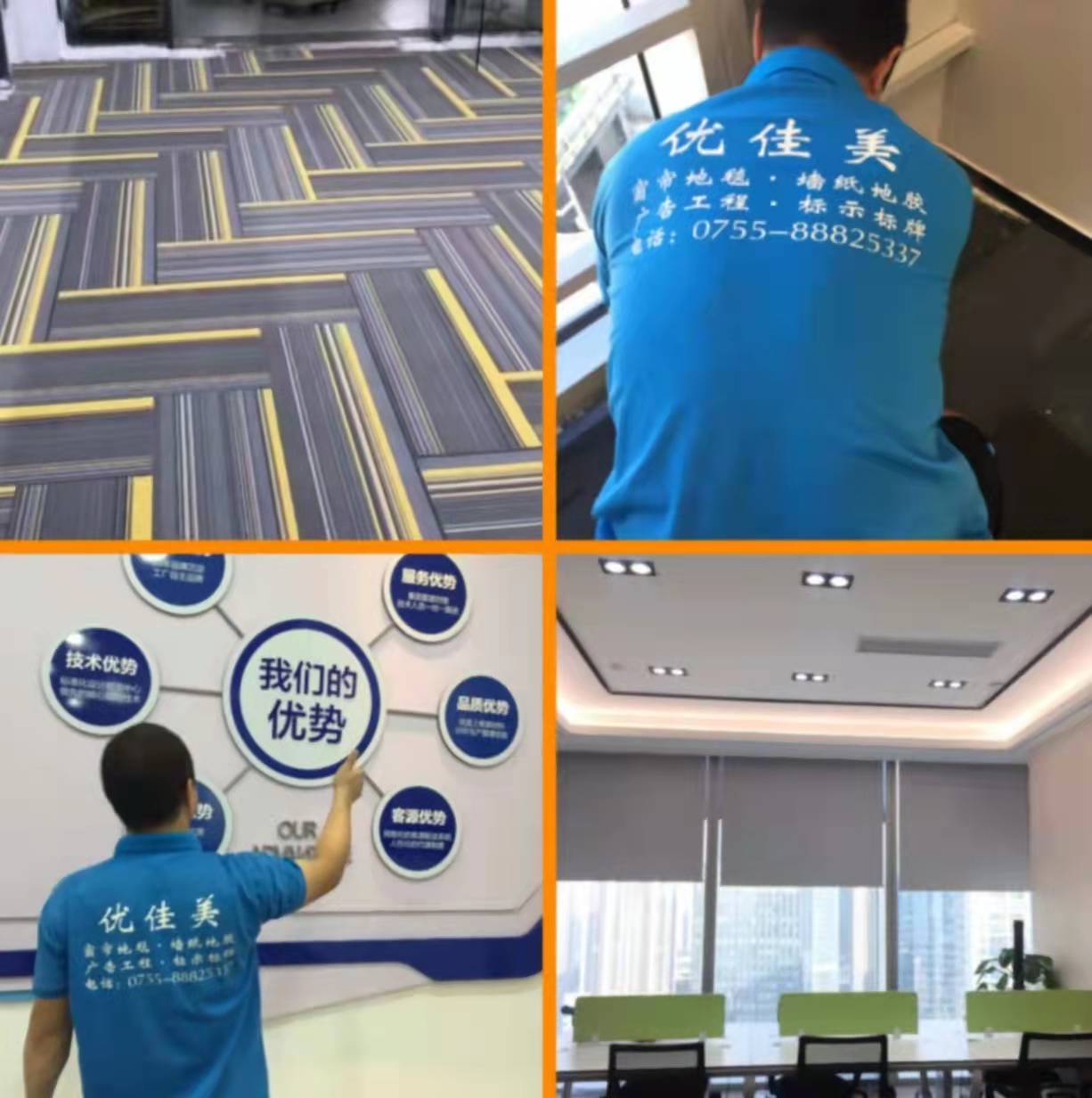 深圳市优佳美装饰有限公司主要经营:办公写字楼遮阳窗帘、电动窗帘、百叶帘、遮阳卷帘、垂直帘、软门帘、等....各种窗帘。地毯系列:办公地毯、方块地毯,PVC地毯,羊毛手工地毯,酒店.宾馆专用大堂.客房,过道地毯,按客户要求材料.图案.形状.尺寸,定做各种风格手工地毯,定做各类PVC门垫与电梯地毯、地毯清洗与维护、我们 拥有专业的施工队伍与配套工具设备,有专业的窗帘设计工程师。有广大 客户的支持与信任,我们将以优良的品质、一流的服务,与各大客户携手共进。